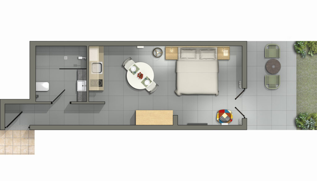 Θα βρείτε αυτό το στούντιο τέλεια εξοπλισμένο για μια χαλαρωτική διαμονή. Το εσωτερικό διαθέτει μια ζωντανή, ζεστή παλέτα χρωμάτων που φωτίζει αμέσως τη μέρα σας. Ο σύγχρονος σχεδιασμός χρησιμοποιεί προσεκτικά επιλεγμένα διακοσμητικά στοιχεία για να κάνει τον χώρο να μοιάζει με το άνετο διαμέρισμα της πόλης σας. Αποκτάτε αυτονομία με μια πλήρως εξοπλισμένη μικρή κουζίνα, που σας επιτρέπει να μαγειρέψετε ή να ετοιμάσετε ένα σνακ χρησιμοποιώντας τοπικά προϊόντα που προέρχονται από τον βιολογικό μας κήπο. Μπορείτε να απολαύσετε τον πρωινό σας καφέ στο ιδιωτικό σας μπαλκόνι με θέα στους όμορφους κήπους: ώρα να χαμογελάσετε!