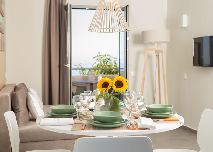 Enjoy true comfort in our spacious suite. The maisonette design gives a feeling of luxury and home, extending across two floors for maximum living space. The decoration uses a bright, airy color scheme complemented by elegant, handcrafted touches that elevate your entire stay. You benefit from two separate bedrooms, providing excellent privacy for everyone in your party. The spacious main bathroom features a rain shower, and you have the convenience of a second WC. The large lounge area accommodates extra guests easily. Experience full self-sufficiency with the full kitchen and dining table. With two private balconies, you have extra spots for relaxation and incredible moments together.